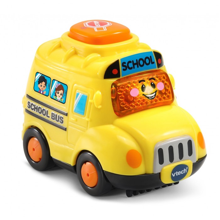 Stop the traffic! Here comes the Go! Go! Smart Wheels® School Bus! Steve the School Bus is just the right size for kids' hands and sports a friendly, light-up face button that plays phrases, sing-along songs and six melodies. Toddlers also learn the letter "S" during imaginative play. A mechanical button extends the school bus's stop sign to encourage fine-motor skills with button pressing. Pushing the school bus around triggers fun role-play sound effects. Take Steve the School Bus for a ride on Go! Go! Smart Wheels® playsets (sold separately) and discover more phrases, songs, sounds and lights as he rides over the SmartPoint® locations. Intended for ages 1-5 years. Requires 2 AAA batteries. Batteries included for demo purposes only. New batteries recommended for regular use.